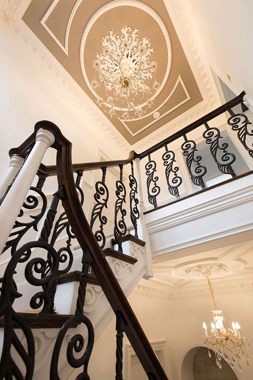 Bringing current lighting to elliptical and circular coffers with crystal chandeliers topped by bespoke modern versions of classical centrepieces developed for this project. Each elevation delivers a visual experience with each element considered carefully .