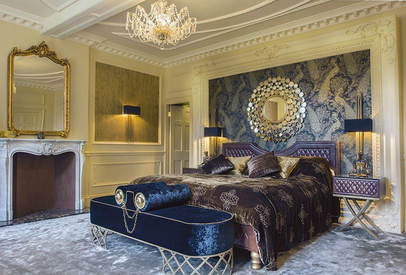 Bespoke Modillion Cornices from corresponding designs tie the individual room decorative schemes together punctuated by wall and ceiling panels with an individual commissioned statement enriched bed head frame stealing the show.