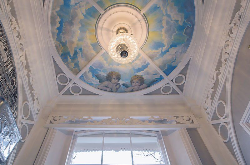 Built in 1873 with some alterations around 1890. Plastered panels with reliefs of classical motifs included in the properties Grade II listing were blended into the scheme for the Grand Entrance Hall with the Victorian 'tented wooden veranda' providing inspiration for the unique Cloak Room. Individual commissions including a large bespoke Mirror Frame enriched with Acanthus leaves concealing a Television behind.